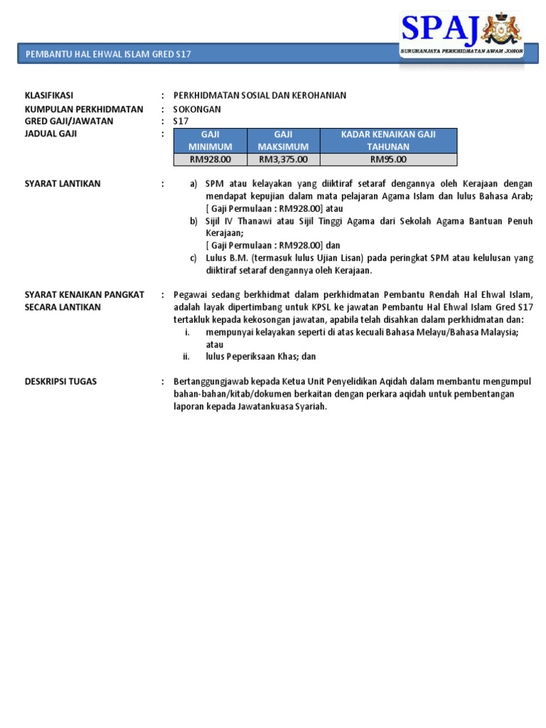 Gaji Minimum Gaji Maksimum Kadar Kenaikan Gaji Tahunan Pembantu Hal Ehwal Islam Gred S17